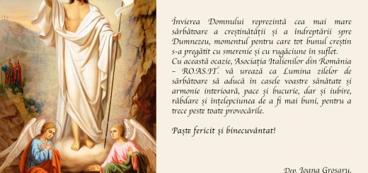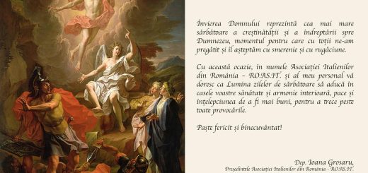 La Resurrezione del Signore rappresenta la più grande festa della cristianità e il ricongiungimento con Dio, momento per il quale ci siamo preparati e che aspettiamo con umiltà, raccolti in preghiera. In quest’occasione, in nome dell’Associazione degli Italiani in Romania – RO.AS.IT. e a mio nome, vi auguriamo che la Luce di questi giorni di festa porti nelle vostre case...